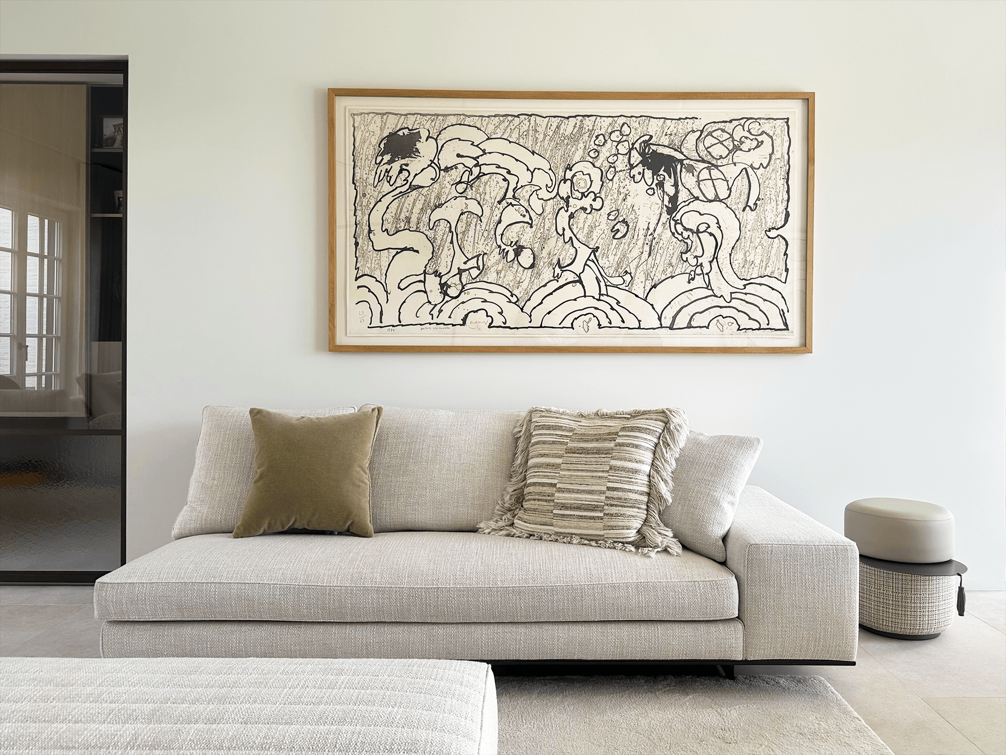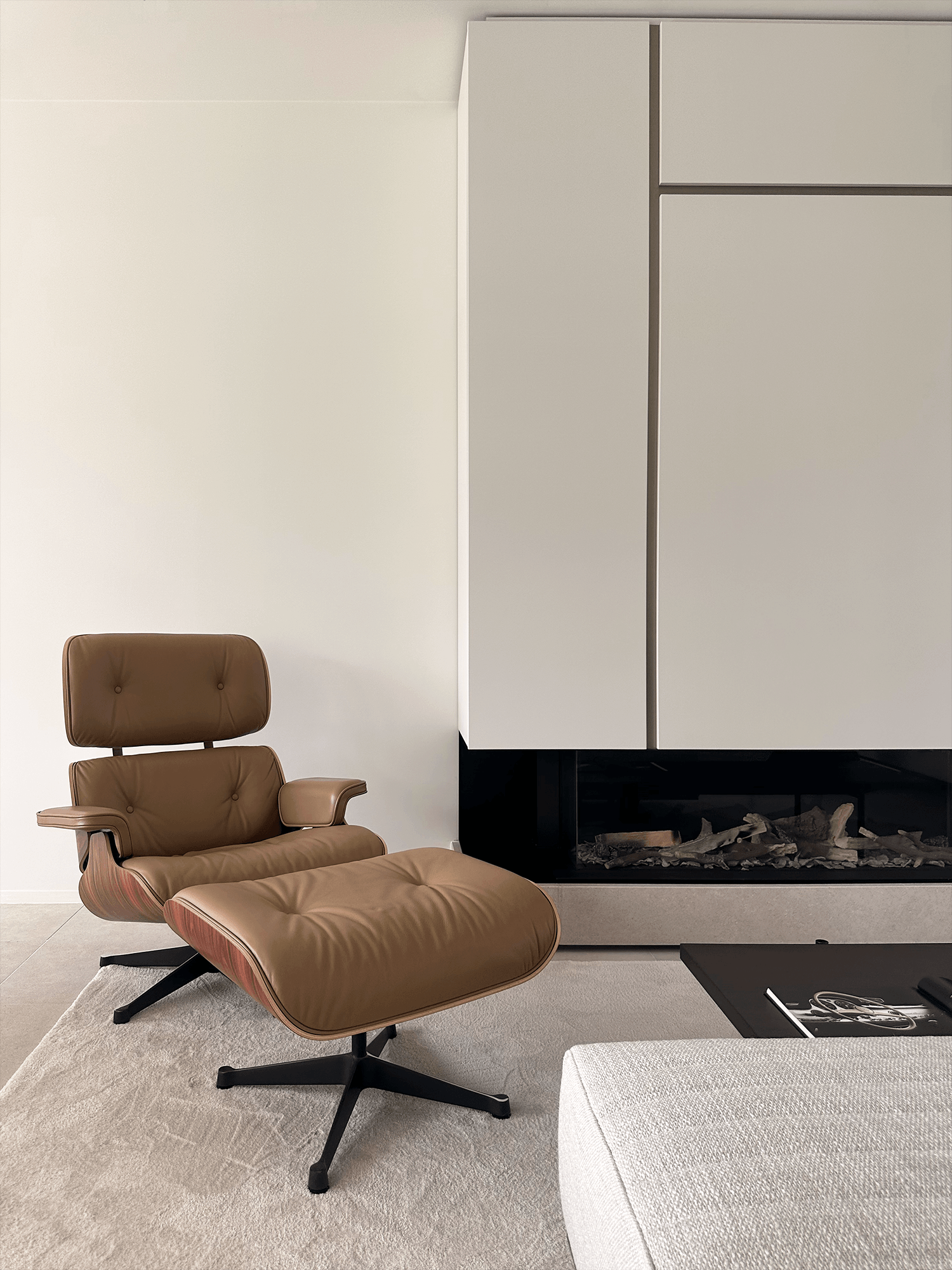 Iconische stukken zoals de Vitra Eames Lounge Chair en de Knoll Barcelona Chair geven het geheel karakter en extra uitstraling. Kunst brengt nog meer ziel en persoonlijkheid in de ruimtes.